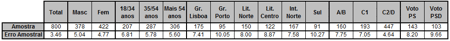 Foram realizadas 800 entrevistas telefónicas válidas, tendo sido utilizados 21 268 números de telefones, e realizado um total de 31 074 contactos telefónicos.